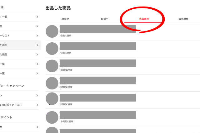 2. 「売却済み」一覧から削除したい商品を選択する