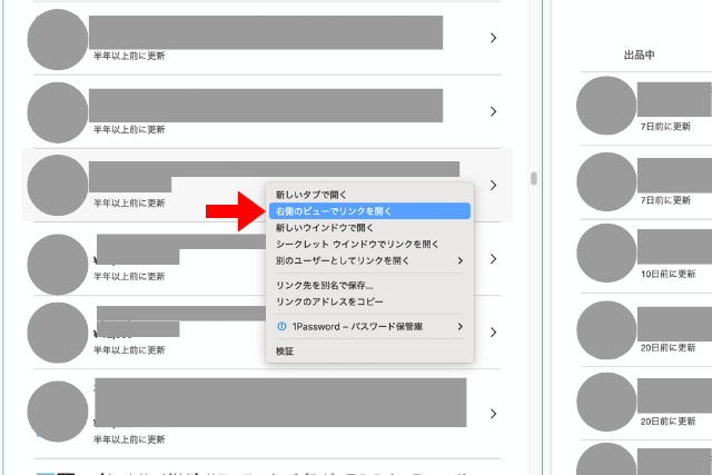 5. 左の画面で削除したい商品を右クリックし、「右側のビューでリンクを開く」を選択