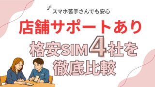 格安SIM スマホが苦手でも安心!店舗サポートあり格安SIM厳選4社を主婦が比較【2026年最新】 格安SIMは料金が安いけど、トラブルのとき店舗がなくて不安…。そんな方へ、店舗で対面サポートが受けられる格安SIM4社を厳選比較しました。UQモバイル・mineo・楽天モバイル・イオンモバイルを主婦目線で徹底解説します。 2026.04.15 格安SIM